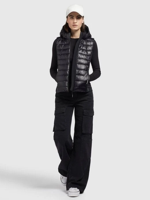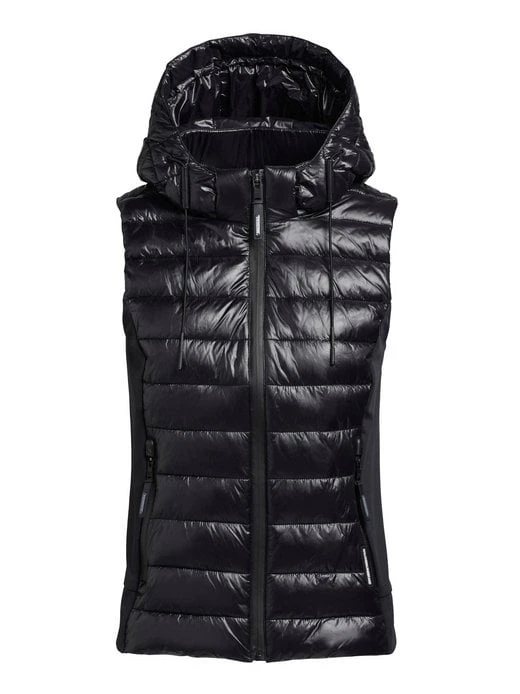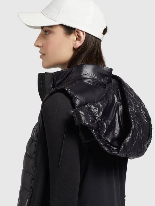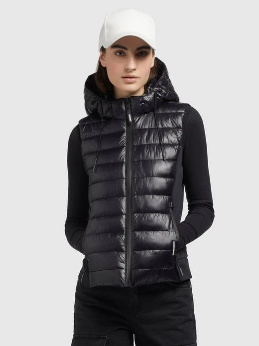 Die leicht glänzende khujo Weste FABIA SHINY mit abnehmbarer Kapuze, einem elastischen Kordelzug und einer leichten Wattierung in der gesteppten Vorderseite, Kapuze und der Passe im Rückenteil lässt sich vielseitig kombinieren. Dank einem Reißverschluss und seitlichen Reißverschlusstaschen mit einer wasserabweisenden Beschichtung, einer Windschutzblende und einem verstärkten Stehkragen bist Du mit dieser hüftlangen Steppweste gut ausgestattet.