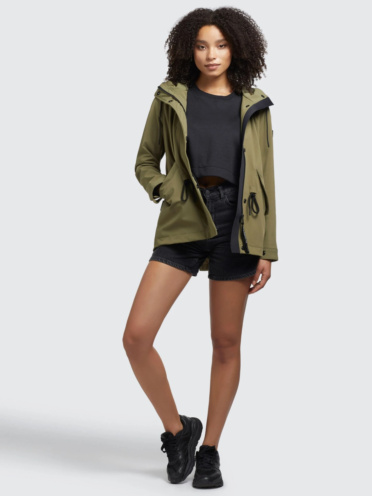 – Kordelzüge an Kapuze und Taille
