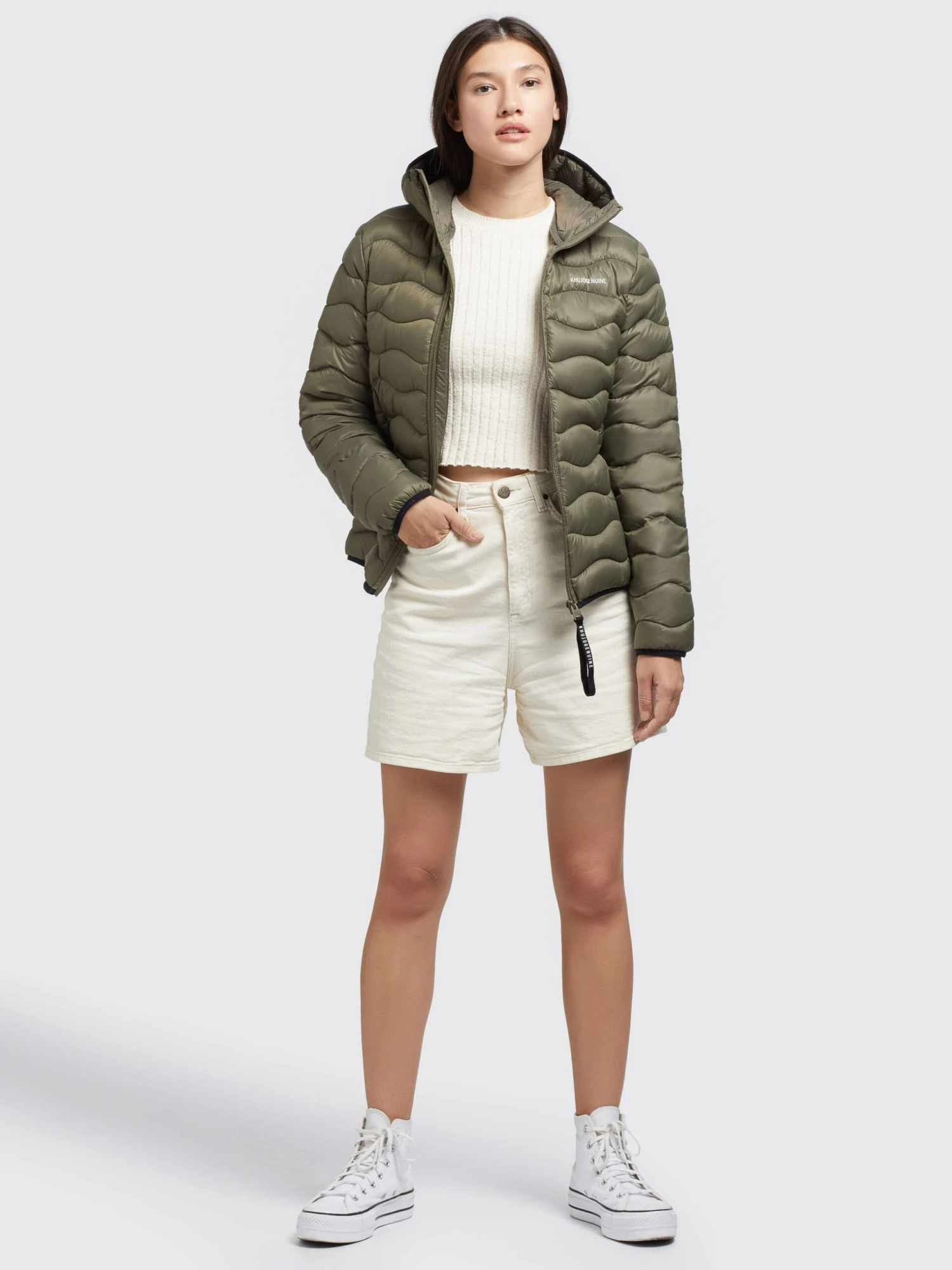 Die hüftlange khujo Jacke NANNA im Reguar Fit mit hoch schließender Kapuze, gestepptem Wellenmuster und einer leichten Wattierung präsentiert sich minimalistisch und sportlich zugleich. Dank einem Reißverschluss mit Kinnschutz, seitlichen Eingrifftaschen mit Reißverschluss, zwei Innentaschen und elastischen Bündchen an Ärmeln und Saum bist Du mit dieser Steppjacke optimal ausgestattet.